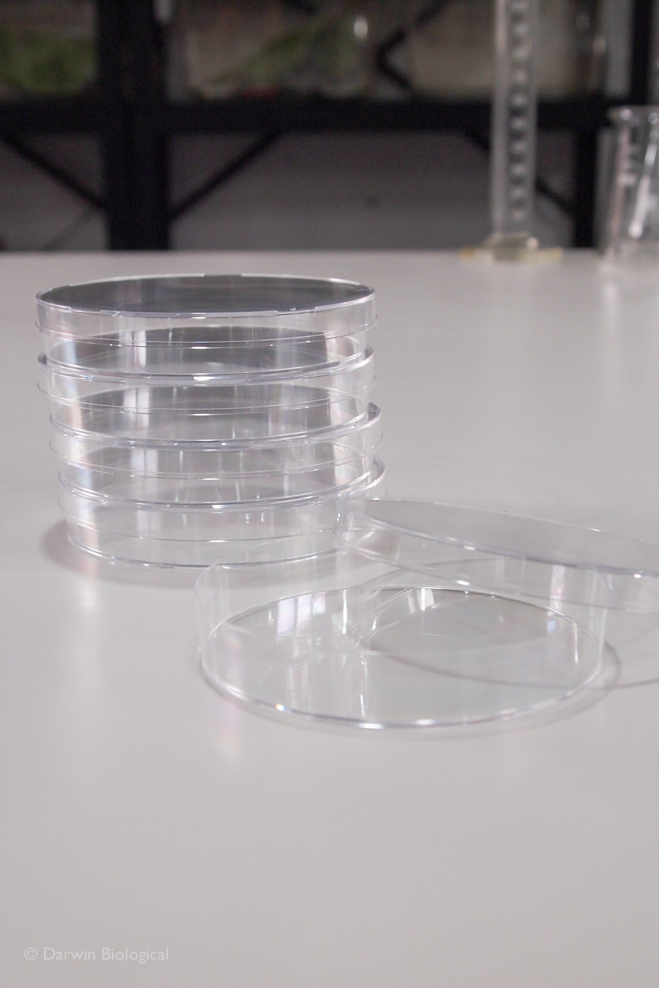 90mm diameter, triple vented, clear plastic (polystyrene) sterile petri dishes. 15mm deep.
